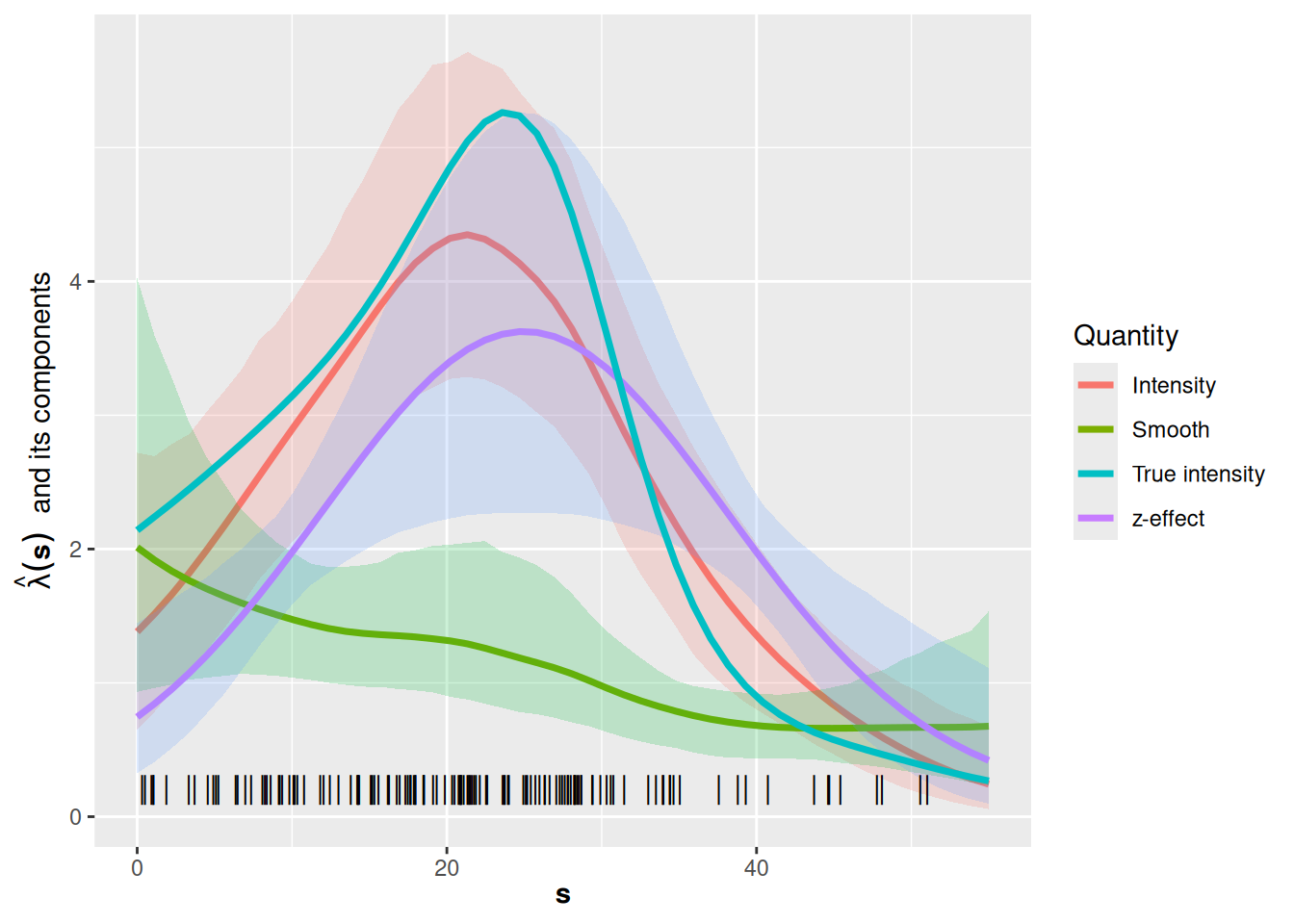 geom_line(aes(x, lambda2_1D(x), colour = "True intensity"), lwd = 1.25) +